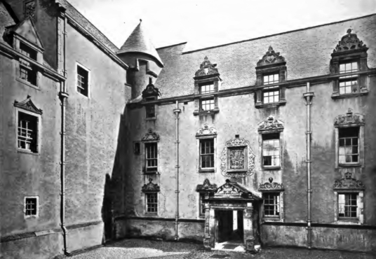 Gabled blocks with corbiestepped gables and dormer windows surround a courtyard, while one side is enclosed by a wall with a gate. Semi-polygonal stair-towers in the courtyard are crowned by conical roofs. There are fine views from the Lodging and a walled garden.