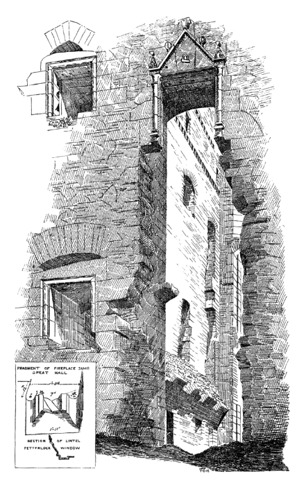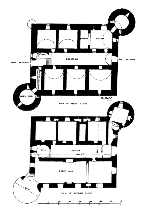 The basement is barrel-vaulted, and contained the kitchen and cellars. Passages ran the length of the building on each floor, from which individual chambers were reached – rather than each chamber opening into the next. A turnpike stair rose at one end of the passage. The hall was on the first floor with an adjoining private chamber, while many rooms occupied the floors above.